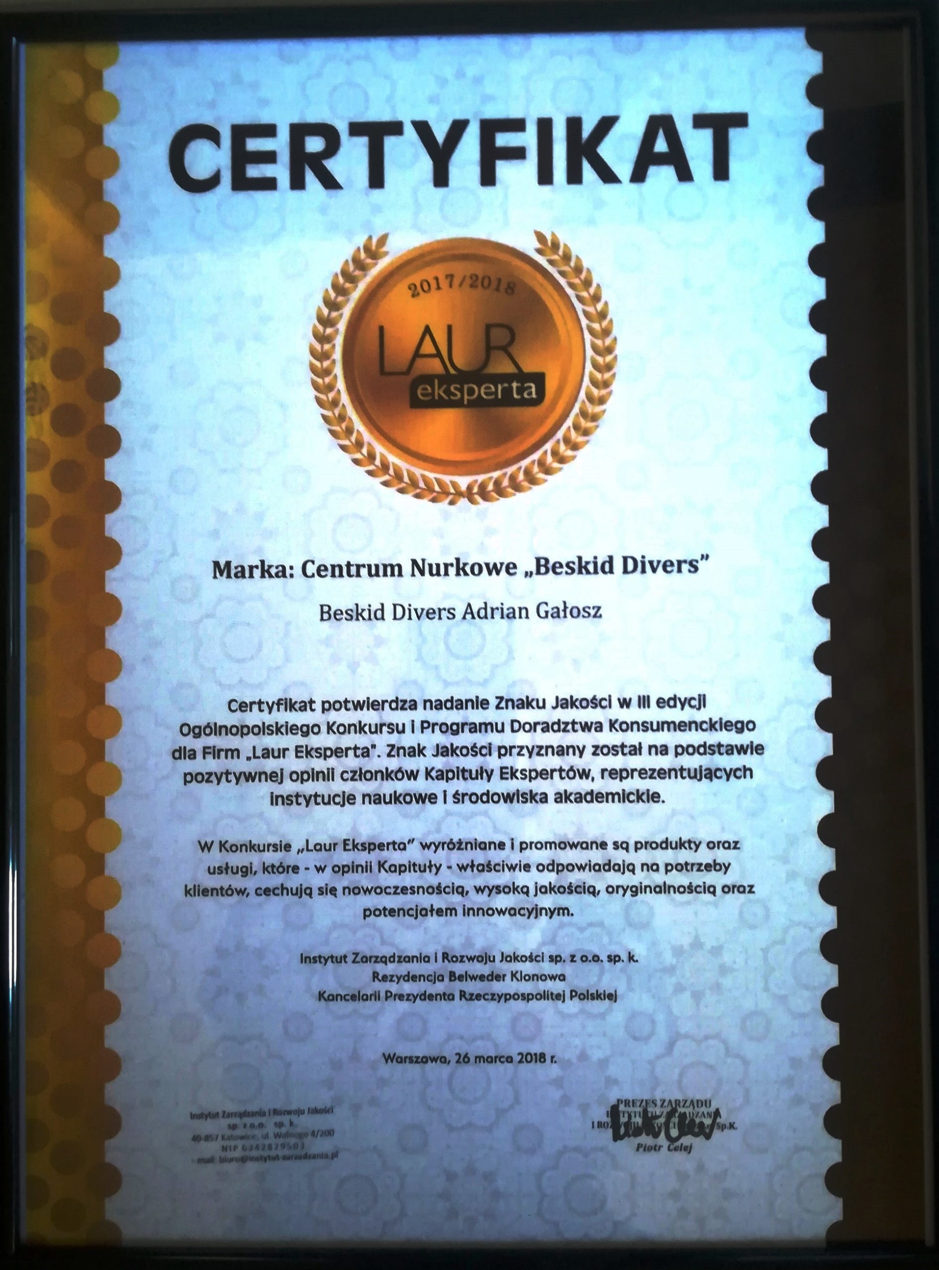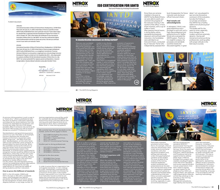 Centrum Nurkowe BeskidDivers Adrian Gałosz przeprowadziło Kursy Instruktorskie, Kursy Nurkowania Rekeracyjnego które doprowadziły do uzyskania certyfikatu ISO dla IANTD  International Association of Nitrox & Technical Divers United States of Amercica dla całego Świata !